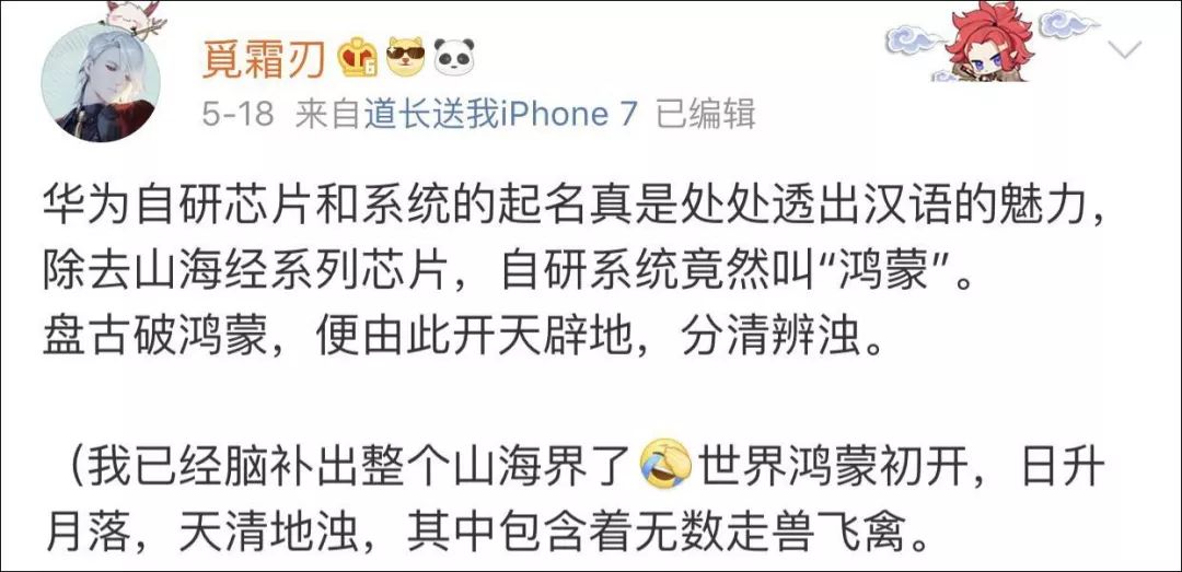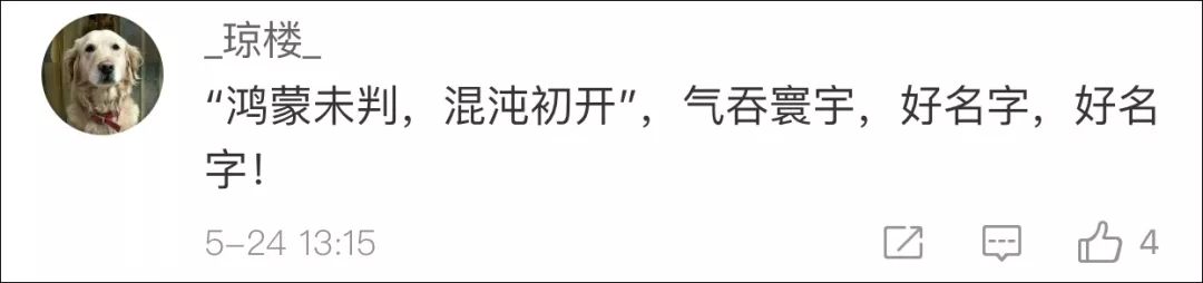 一位网友在微博上这样写道:“太燃了!华为新系统叫‘鸿蒙’,鸿蒙即混沌,世界之初,已有鸿蒙,即将盘古开天地。”