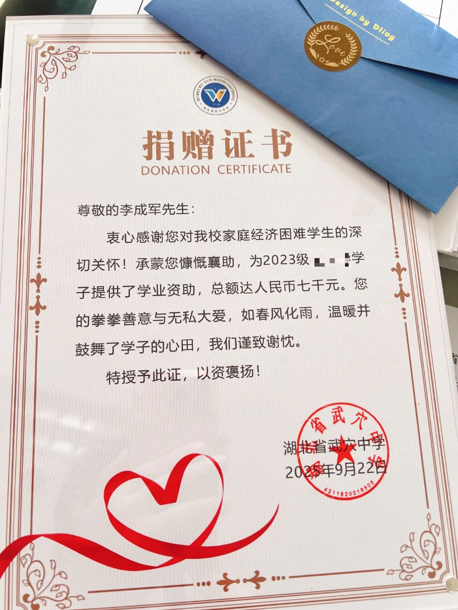 证书上的文字,记录着一份普通劳动者的大爱:“承蒙您慷慨襄助,为2023级一名女生提供学业资助,总额达七千元。您的拳拳善意,如春风化雨温暖学子心田。