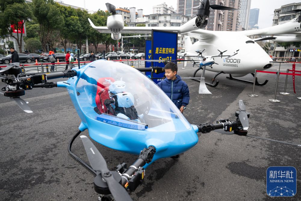 ↑ 2月24日,小朋友在现场观看展出的eVTOL航空器。