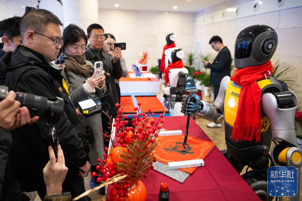 ↑ 2月24日,人形机器人在现场进行书法表演。