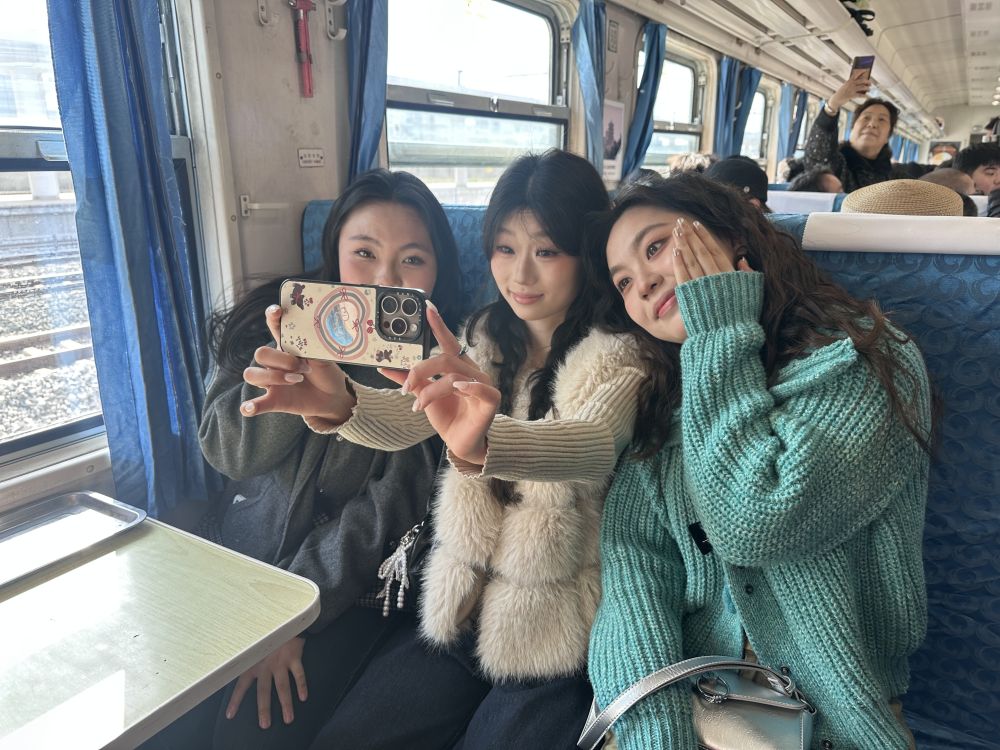 这列由7节绿皮车厢组成的列车里,连体硬座被蓝色座椅套包裹,春风吹过半掩的窗帘,游客们围坐在一起谈笑拍照,有节律的“哐当”声中,每一处景致都让人仿佛回到过去。