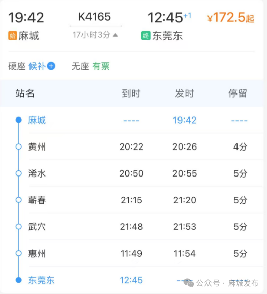 据了解,本次获央视聚焦的K4165次务工专列,自2月21日(正月初五)起开行,至3月6日结束,共开行14天。列车每日19时42分从麻城站发车,途经黄州、浠水、蕲春、武穴、惠州等站,于次日12时45分抵达东莞东站,全程运行约17小时,实现了从家门口到厂门口的“一站式”直达,极大方便了麻城市及周边县市在粤务工人员的返岗旅途。