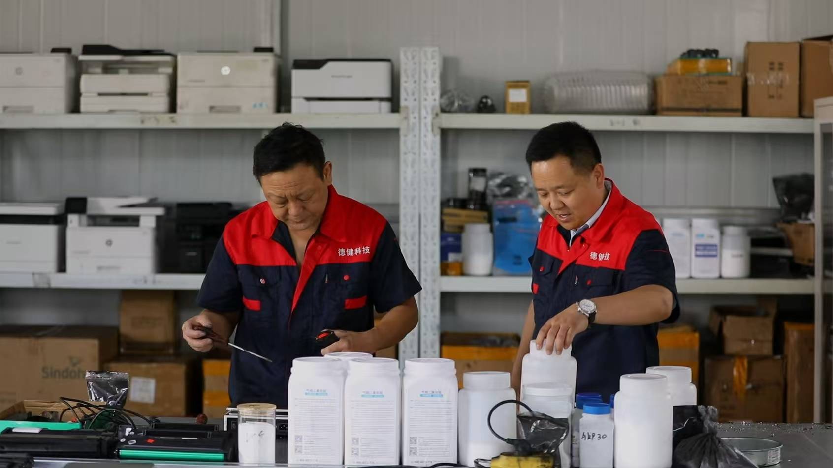 回到团风县,李祥与合伙人汪洋共同投资5800万元,创办德健科技,主要专注于打印耗材的研发与制造,尤其是高端墨粉的国产化攻关。