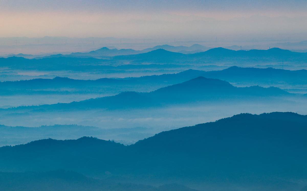 4月26日清晨,武汉黄陂云雾山晨曦初露,山峦层叠起伏,云雾萦绕山间。日出霞光漫染山野,景致清幽壮阔,宛如现实版千里江山图。(湖北日报全媒记者 柯皓 摄)